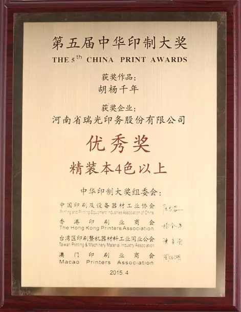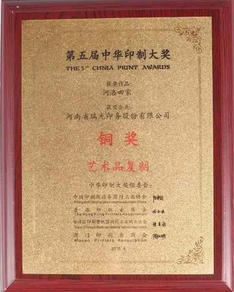2015年4月7日,河南省瑞光印務(wù)股份有限公司選送的印品《河洛四家》獲得銅獎(jiǎng);《胡楊千年》獲得優(yōu)秀獎(jiǎng)。