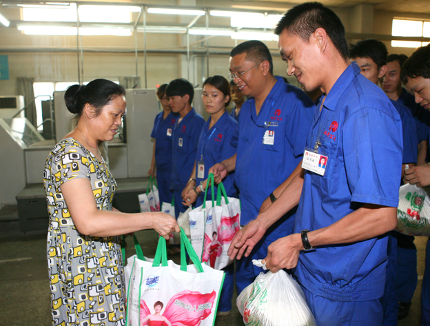 此次活動在瑞光印務(wù)彩印車間舉行,帶著黨和政府的一片關(guān)愛之情,區(qū)總工會相關(guān)領(lǐng)導(dǎo)來到瑞光,看望慰問在高溫酷暑下堅持工作的職工們,給大家送來了洗化用品、綠豆、水杯、毛巾等防暑物品。