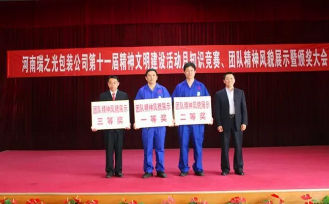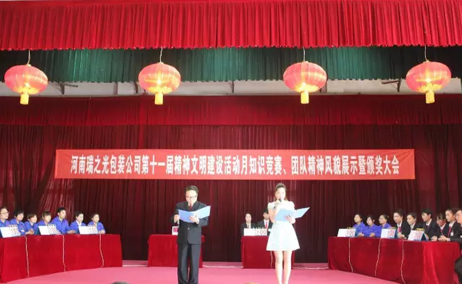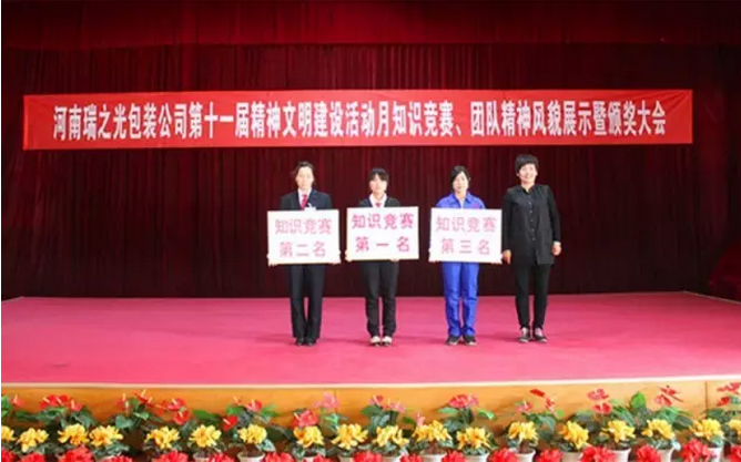 4月29日下午,河南瑞之光包裝印刷股份有限公司舉行第十一屆“精神文明建設(shè)活動(dòng)月”知識(shí)競賽、團(tuán)隊(duì)精神風(fēng)貌展示暨頒獎(jiǎng)大會(huì)。河南瑞之光文化產(chǎn)業(yè)集團(tuán)總裁張歌偉攜集團(tuán)領(lǐng)導(dǎo)班子出席此次活動(dòng)。活動(dòng)現(xiàn)場根據(jù)公司《愛心基金管理辦法》進(jìn)行愛心基金捐款,隨后,開展了知識(shí)競賽和團(tuán)隊(duì)精神風(fēng)貌展示,經(jīng)過各參賽隊(duì)伍的激烈角逐和評(píng)委們的認(rèn)真選評(píng),現(xiàn)場評(píng)出冠、亞、季軍并當(dāng)場頒獎(jiǎng)。