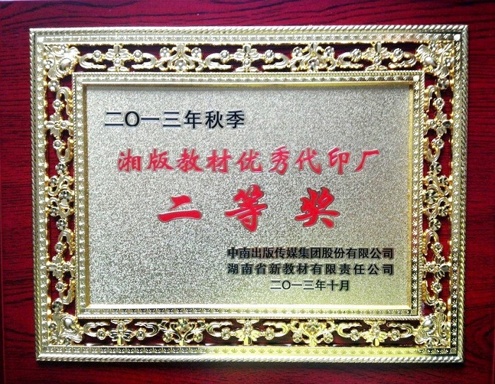 我公司印制的湘版教材由于印制質(zhì)量、周期良好,及服務(wù)等整體突出,在中南出版?zhèn)髅郊瘓F(tuán)股份有限公司、湖南省新教材有限責(zé)任公司2013年23家代印廠綜合考評(píng)中表現(xiàn)優(yōu)異,榮獲“湘版教材優(yōu)秀代印廠二等獎(jiǎng) ”。